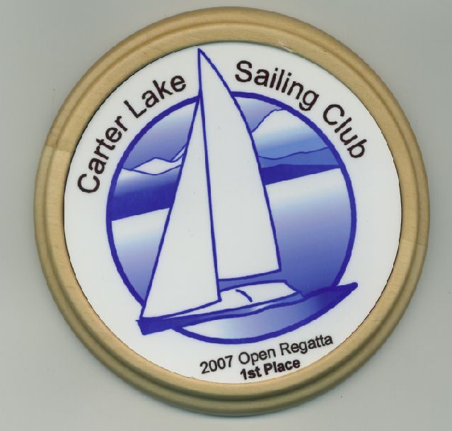 Our round coasters come inset in a mahogany or natural wooden trivets. They measure 4.25" in diameter and make a unique recognition gifts for special occasions or events. Names and dates can be imprinted above and below the logo to make your coaster set unique for the person or occasion. This sample coaster was given as awards to members of the Carter Lake Sail Club for the 2007 Open Regatta.