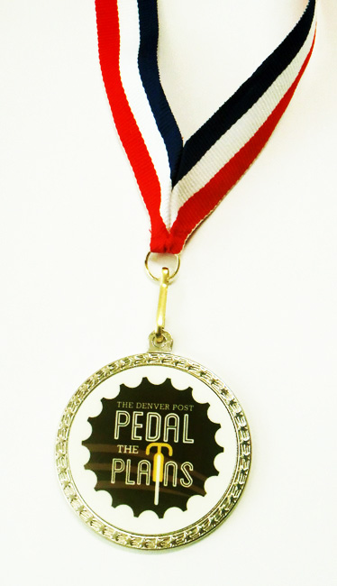 Pedal the Plains Color Printed on a 2" round gold, white, or silver die and then inserted into a gold medal holder. Click on