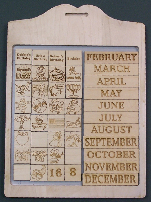 Engraved in your choice of wood (Or two tone with one species for the frame and another for the tiles). Excellent gifts for Employee Recognition, Client Appreciation, Weddings, Anniversaries, or any other special occasions. Each tile has a magnet on the back. Change month to month is EASY. We provide
