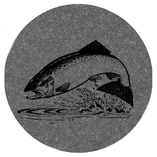Round granite coasters- Jumping fish with your personalized message underneath.
